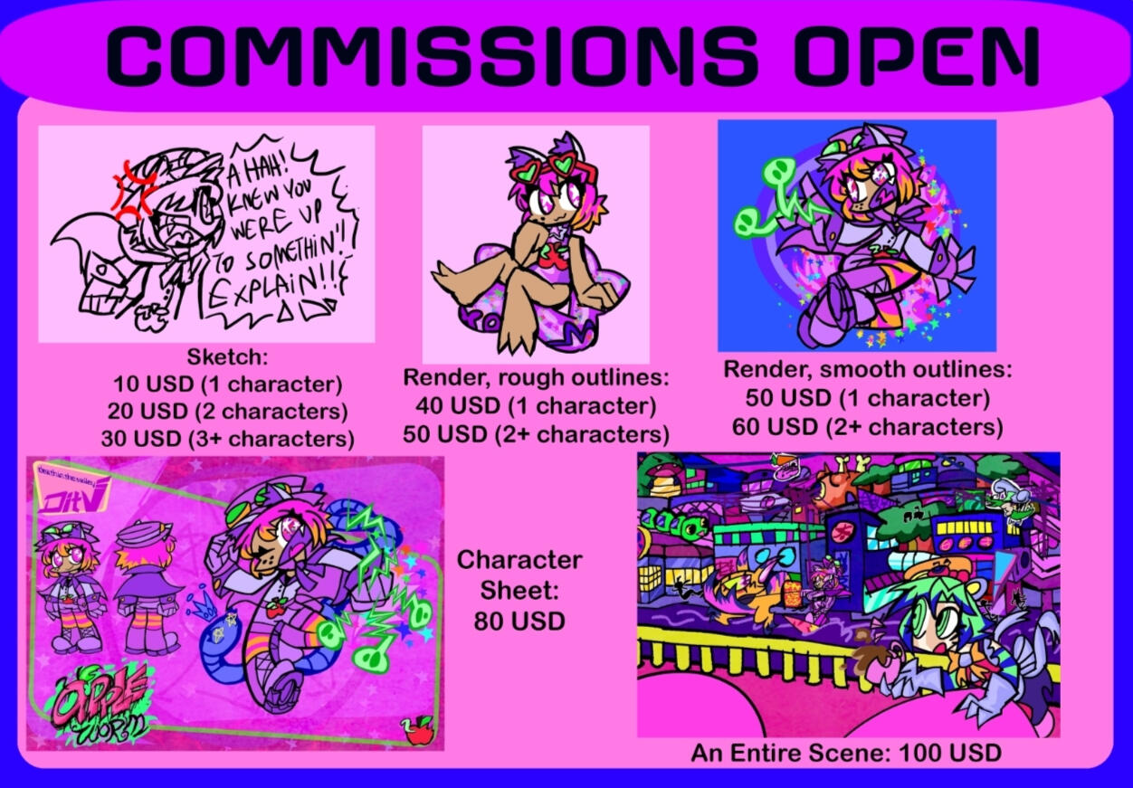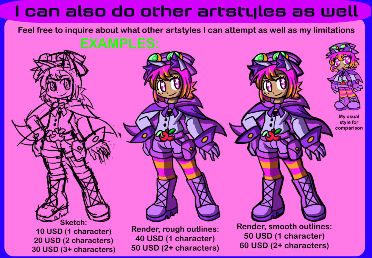 But I ABSOLUTELY WILL NOT DRAW realistic art styles, overly desaturated colorschemes, bigotry, certain types of inflation fetish, force feeding, poop, piss, farting, diapers, and extreme gore, IRL models of vehicles (unless I can adapt it to be more fantasy-like), as well as anything supporting any specific IRL regime, countries or governments, this is not an extensive list and some exceptions may apply, please inquire for specifics.